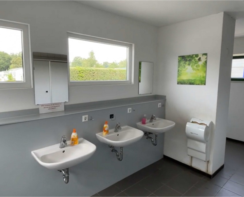 Unser moderner Sanitärbereich erfüllt aktuelle technische Standards und bietet Ihnen Einzelduschkabinen, Handwaschbecken und Toiletten.